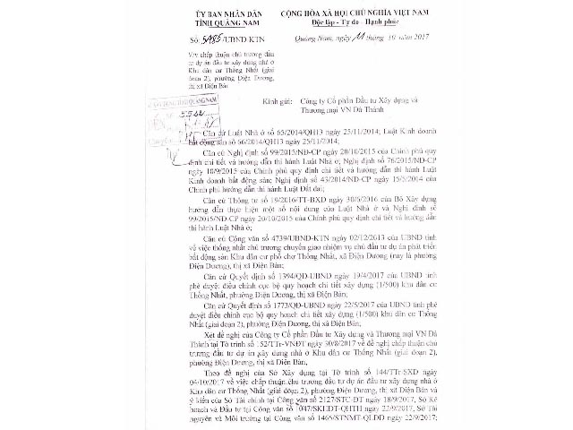 Ngày 11 tháng 10 năm 2017, UBND tỉnh Quảng Nam có văn bản số 5485/UBND-KTN về việc chấp thuận đầu tư Dự án Khu dân cư Thống Nhất (giai đoạn 2), phường Điện Dương, thị xã Điện Bàn, thế nhưng chỉ một thời gian ngắn sau đó, chủ đầu tư là Công ty Cổ phần Đầu tư Xây dựng và Thương mại VN Đà Thành (có trụ sở tại số 63 Lê Lợi, Thạch Thang, Hải Châu, TP.Đà Nẵng) đã tổ chức làm văn bản thỏa thuận góp vốn đầu tư dự án bất động sản tại dự án này.